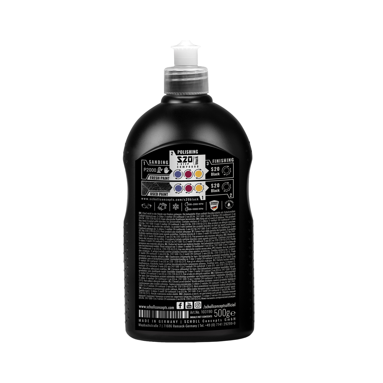 S20 Black ist eine visionäre und einzigartige 1-Step Hochleistungs-Paste mit einem äusserst breiten Leistungsspektrum auf allen bekannten Lacksystemen. Eine Revolutionäre Schleifpaste zur äusserst effizienten Beseitigung von Kratzern, Gebrauchsspuren und Hologrammen bei der Lackaufbereitung. S20 Black ist eine visionäre und einzigartige 1-Step Hochleistungs-Paste mit einem äusserst breiten Leistungsspektrum auf allen bekannten Lacksystemen. Eine Revolutionäre Schleifpaste zur äusserst effizienten Beseitigung von Kratzern, Gebrauchsspuren und Hologrammen bei der Lackaufbereitung.Vorteile: Eine Paste für nahezu alle Lackfinish-Arbeiten auf gebrauchten Lacken - Enorme Abtragsleistung bei minimaler Staubentwicklung - Überragende Glanzeigenschaften - Hologrammfreies Finish auf allen Lacken auch ohne Excenter-Poliermaschine - Die Paste enthält keine Silikonöle, Wachse und toxischen Lösemittel