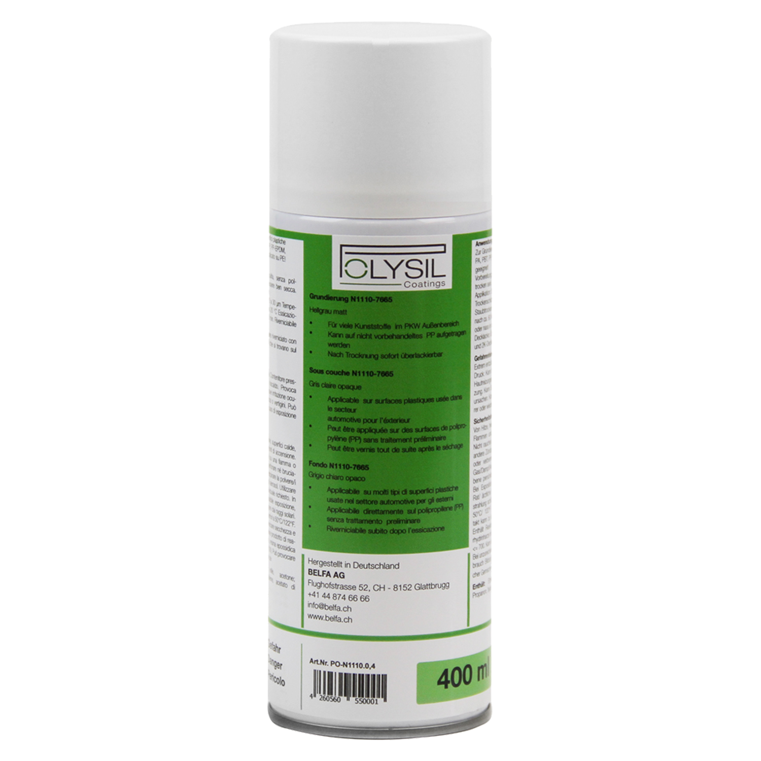 Die Sprühdosen enthalten POLYSIL N1110, eine vollwertige Grundierung, die gleichzeitig als Haftvermittler funktioniert. Oberflächenaktivierung und Beschichtung erfolgen in einem einzigen Arbeitsgang. Die mit POLYSIL grundierten Oberflächen können mit handelsüblichen Base Coats sowie mit 1- oder 2-Komponenten-Lacken überlackiert werden. Die bei konventionellen Grundierungen erforderliche Vorbehandlung mittels Beflammen, Tempern und Anschleifen ist nicht mehr erforderlich.