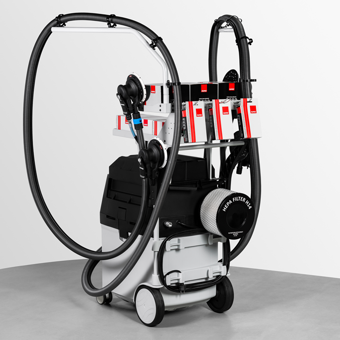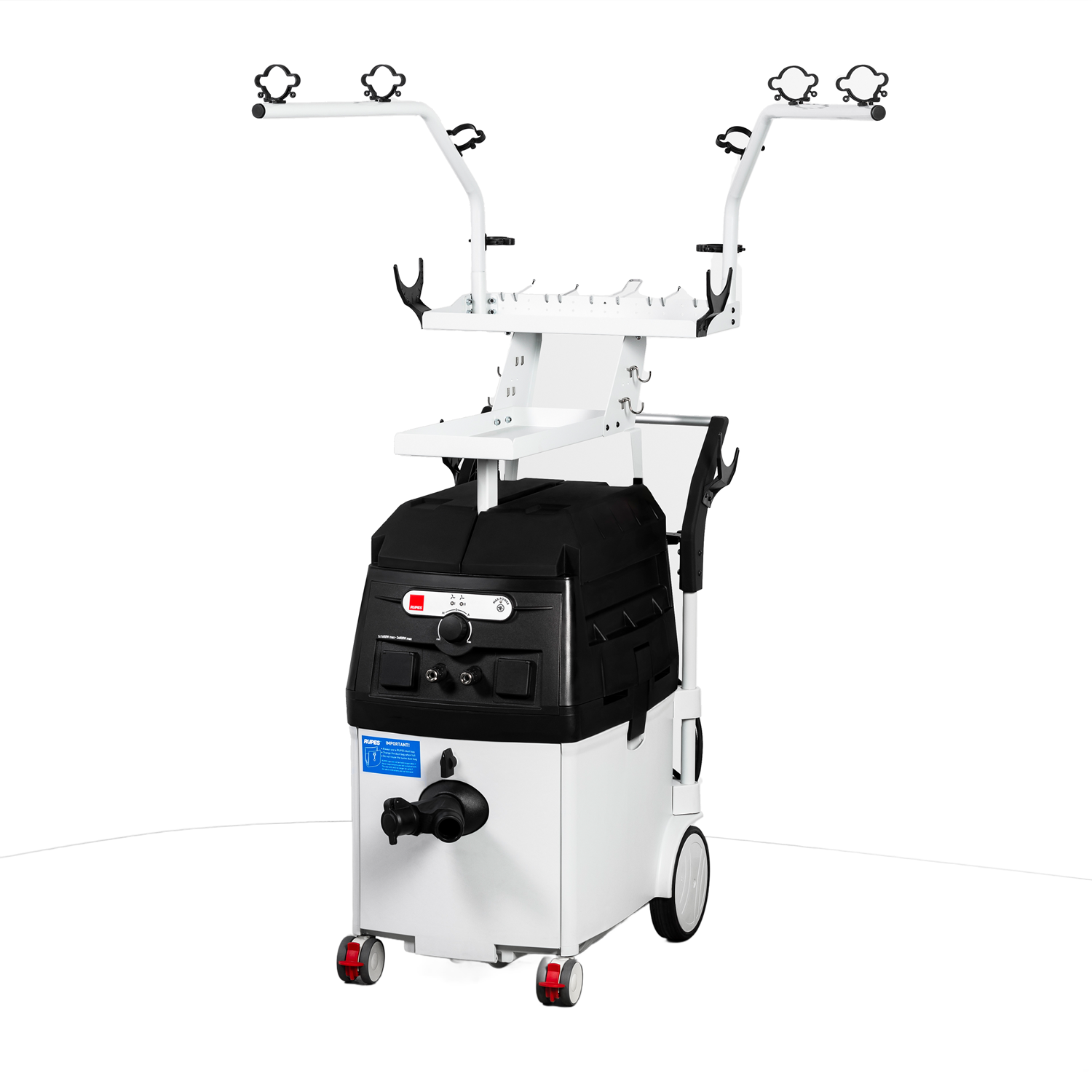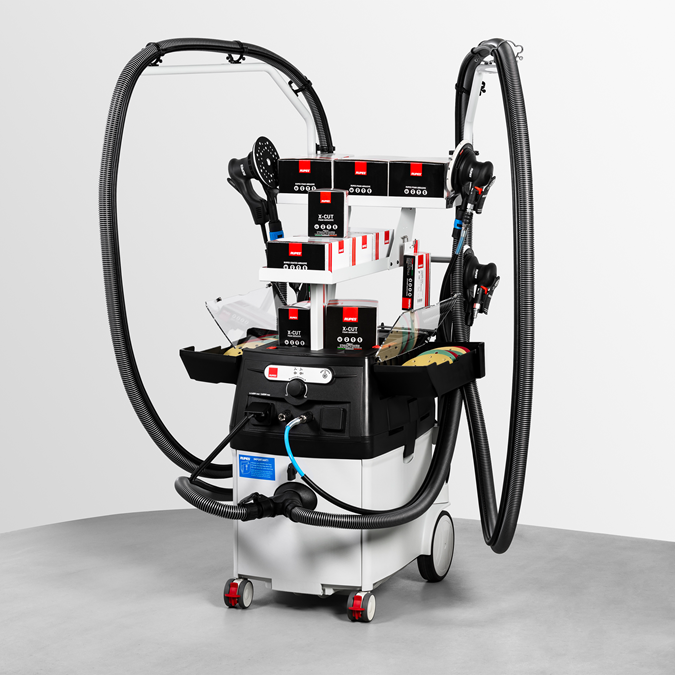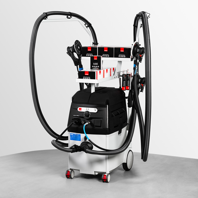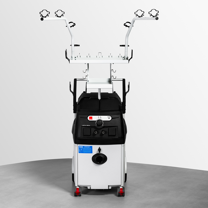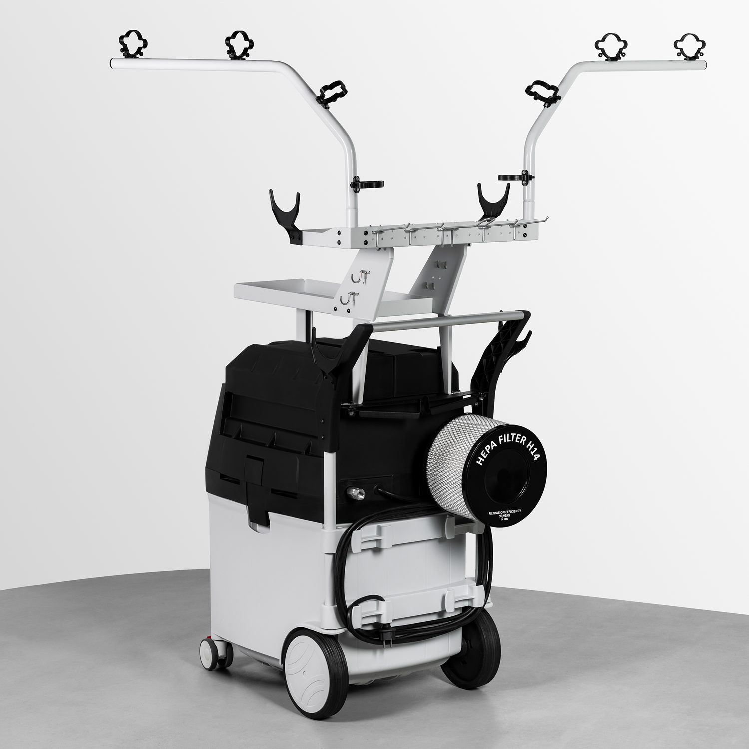 Das Workstationsystem für den Profi-Staubsauger KS 300 erhöht die Effizienz für den Anwender. Mit zwei Schwenkarmen für die Saugschläuche, zwei Ablagen, zwei zusätzlichen Werkzeughaltern und einem Hakenset garantiert dieser Arbeitsplatz Mobilität und sorgt dafür, dass alle benötigten Werkzeuge, Verbrauchsmaterialien und Zubehörteile während der Arbeit immer griffbereit sind.