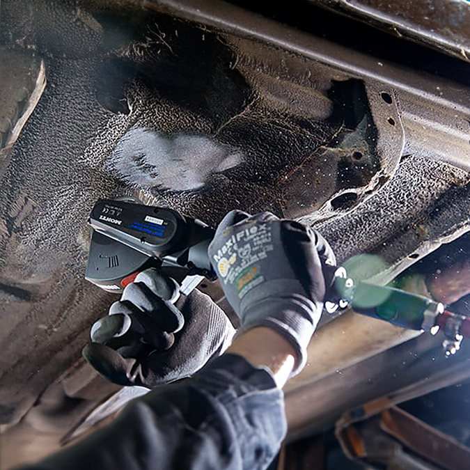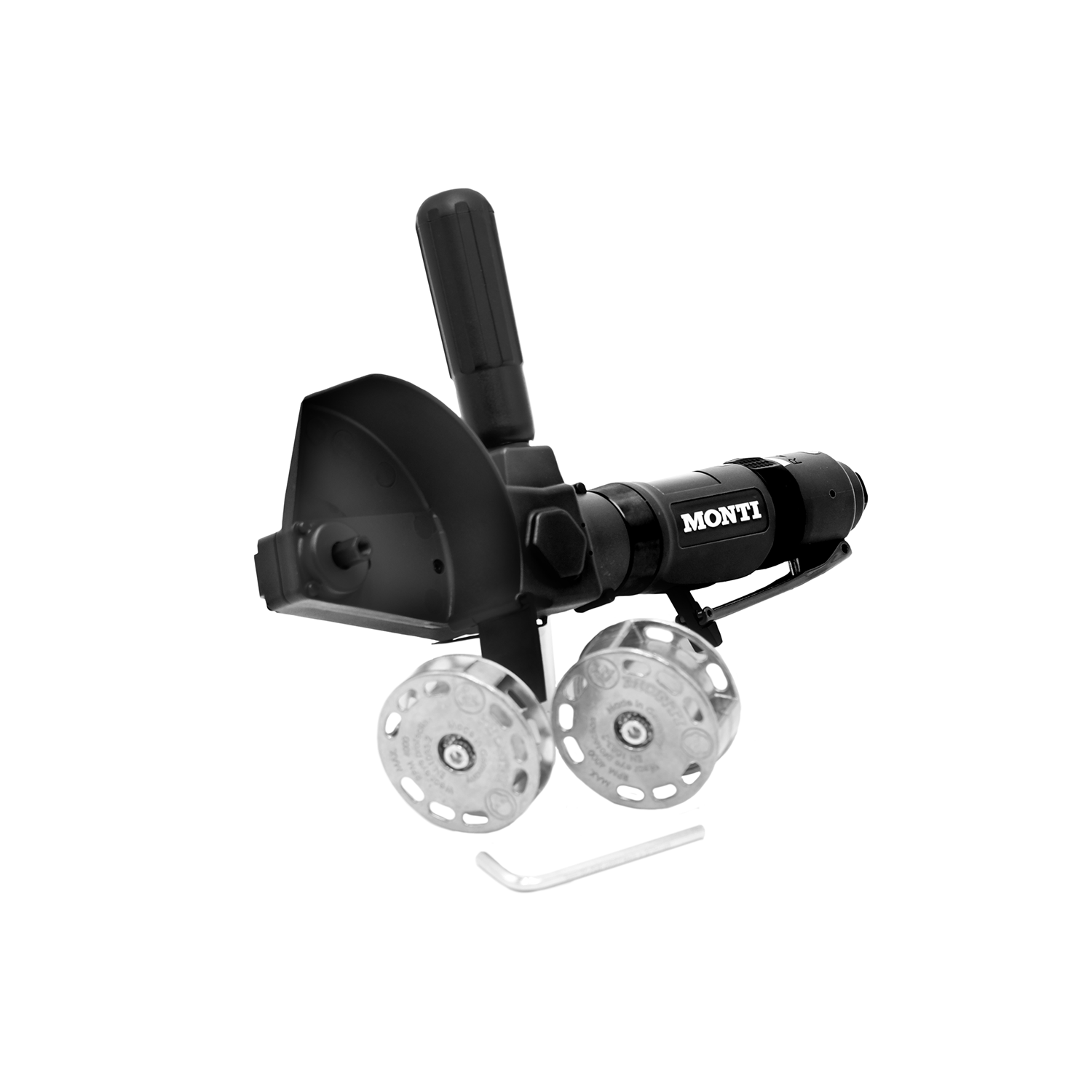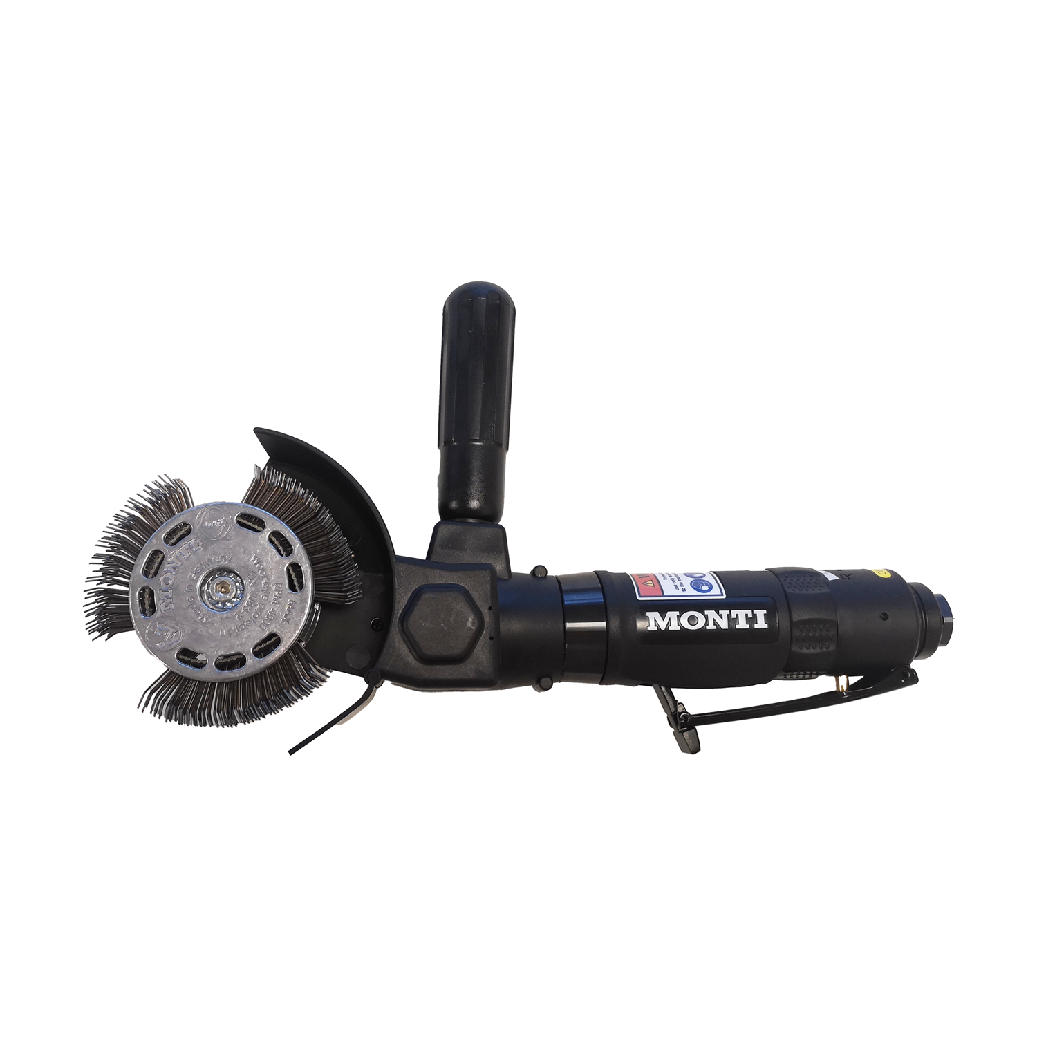 Pneumatisches Werkzeug zum Entfernen von Rost, Korrosion, Oxidation, Klebstoffen, Dichtungen, Farbschichten, Grundierungen, Dichtungsmitteln, Vinyl und zum Abrichten von Schweissnähten in einem Arbeitsgang. Die Band mit flexiblen Drähten rotieren in einem patentierten Gehäuse und diese werden durch die Zentrifugalkraft nach aussen geschleudert, wo sie auf einem Luftpolster wirken. Die speziell entwickelten Borsten sind U-förmige Klammern, die durch einen haltbaren Nylongurt gesteckt sind und eine sichere, langlebige Leistung gewährleisten. - Entfernt schnell Korrosion und Oxidation – sowohl von hartem als auch weichem Material - Funktioniert auch auf unebenen Oberflächen - Hochflexibel in engen Bereichen - Kein Zusetzen oder Verkleben der Borsten - Reinigt Oberflächen gleichmässig - Vollständige Sichtbarkeit der Arbeitsfläche