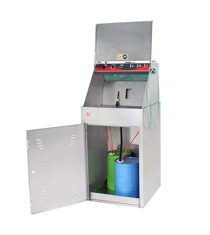 Manuelles Waschen mit Lösungsmittel - Automatische Dampfabsaugung an der Arbeitsstelle - Vorwaschen mit Venturi-Pumpe unter Verwendung von schmutzigem Lösungsmittel - Venturi-Pumpe zur Ansaugung des sauberen Lösungsmittels - Abschliessendes Waschen über Zerstäuber mit sauberem Lösungsmittel - Möglichkeit, 60L-Behälter im Gerät zu lagern - Druckminderer für Farbtests - Völlig aus Edelstahl - ATEX II 2G - Optional Kit M für Lösungsmittel