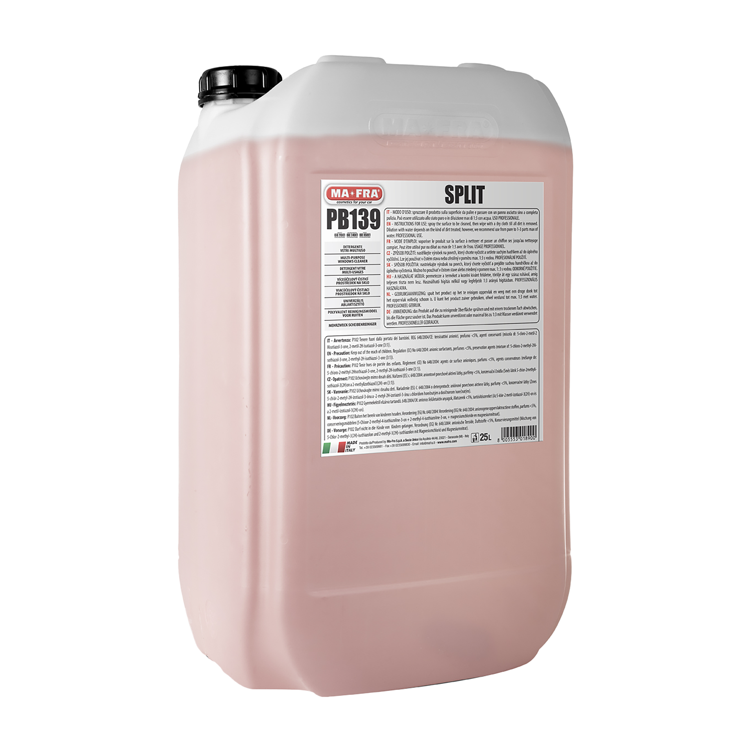 Anwendungsbereich: SPLIT löst schnell und mühelos Rauch, Smogansammlungen, jedes beliebige Fett, Fliegen und Wachsspuren aus der Waschanlage von allen Scheiben des Fahrzeugs und die behandelten Oberflächen finden den ursprünglichen Glanz wieder. Vorteile: SPLIT ist ein Mehrzweckreiniger für Scheiben in Symbiose mit der Umwelt. Die wichtigsten Inhaltsstoffe sind natürlichen Ursprungs und sind praktisch gänzlich biologisch abbaubar. Es enthält kein Ammoniak, der Ursprung seiner Leistungskraft liegt in der Kokosnuss, dem Mais und den natürlichen Tensiden. Dank seiner natürlichen Formel ist es besonders geeignet, um in geschlossenen und schwer zu lüftenden Innenräumen verwendet zu werden, da es im Vergleich zu anderen Produkten verträglich ist. Es trocknet schnell und hinterlässt keine Schlieren. Anwendung und Verdünnung: Auf die zu reinigende Oberfläche sprühen, anschliessend mit einem trockenen Tuch abwischen bis es vollständig sauber ist. Das Produkt wird pur oder bis Maximum 1:3 je nach Schmutz verwendet.