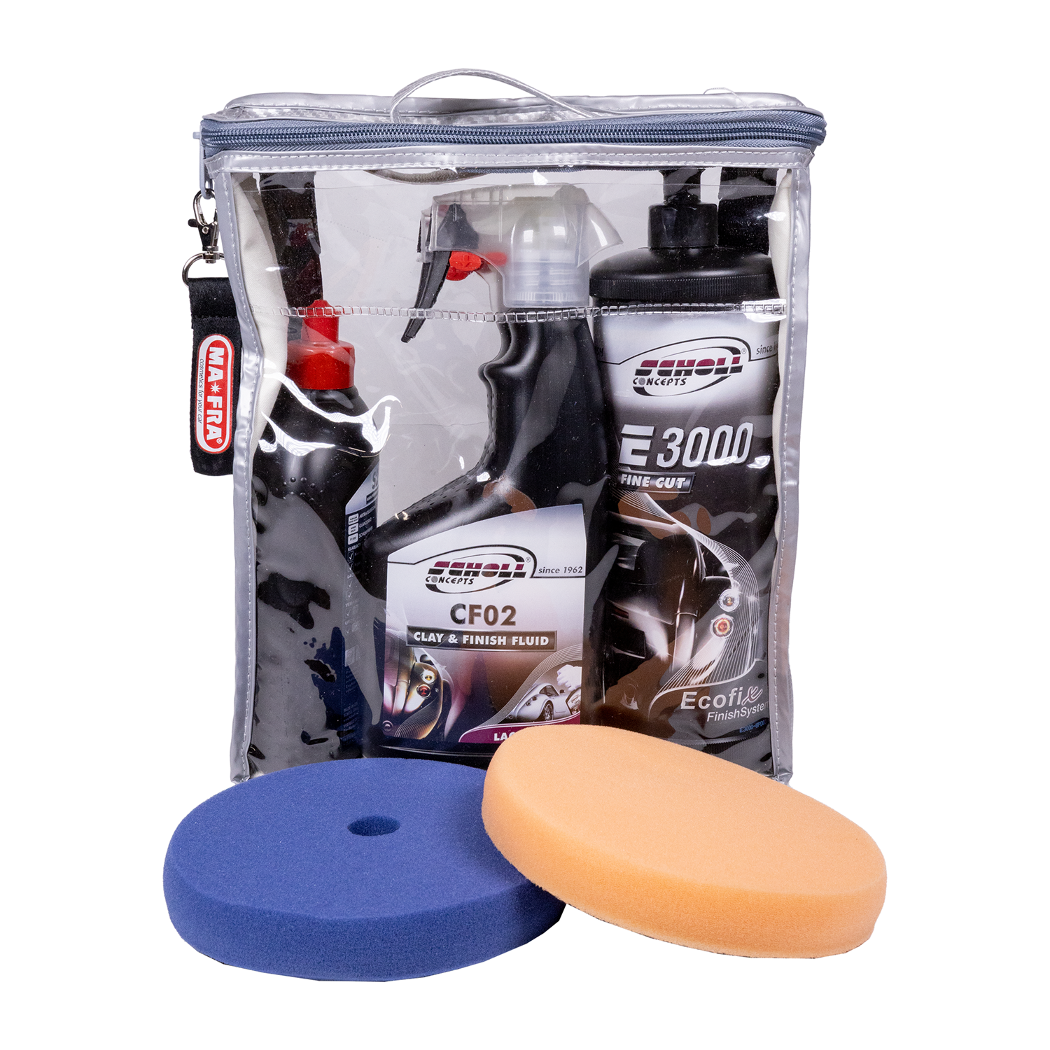 Set enthält: 1 x Premium Speedwachs SW20, 1 x Polierschwamm Spider Pad navy-blue, 1 x Black (Swiss Edition) 1-Step Paste S2, 1 x Fine Cut Paste E3000, 1 x Polierschwamm medium, 1 x Reinigungsspray CF02 Clay & Finish Fluid