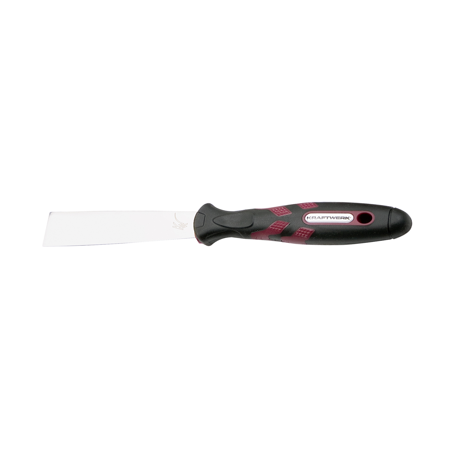 Flexibles Blatt aus rostfreiem Stahl, gehärtet und spiegelpoliert. 2-Komponenten-Softgriff mit abrutschsicheren Griffmulden.