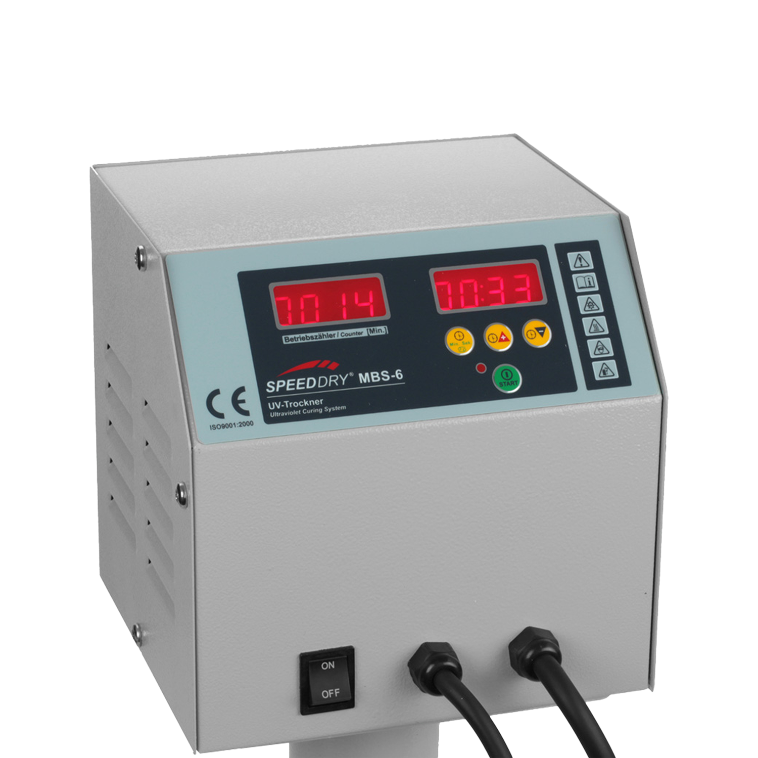 Der UV-Strahler MBS-6 ermöglicht den effektiven Einsatz zur schnellen und vollständigen Durchhärtung von UV-Farben und UV-Lacken. Der Ernergiegehalt des UV-Lichts und des sichtbaren Lichts wird für die UV-Härtung genutzt. Farben und Lacke werden mit UV-Licht in Sekundenbruchteilen getrocknet. Die UV-Trocknung ermöglicht eine bedeutende Reduzierung der Betriebskosten und damit eine preisgünstige Produktion bei gleichbleibend hoher Qualität und Produktivität. - Hochwertige VPOWER UV-Lampe mit einer Lebensdauer von ca. 800 - 1000 h- Besonders widerstandfähiger Reflektor aus Edelstahl- Elektronisches Vorschaltgerät für UV-Lampe- Robustes Stativ aus starken Aluminiumprofilen- Kugelgelagerte Rollen mit Feststellbremse- Heizabstand 80-200mm- Zeitschaltuhr mit 10 Sekunden bis 15 Minuten- Trocknungsfläche 400 x 200mm