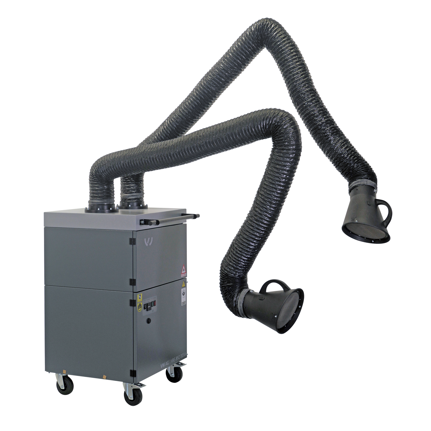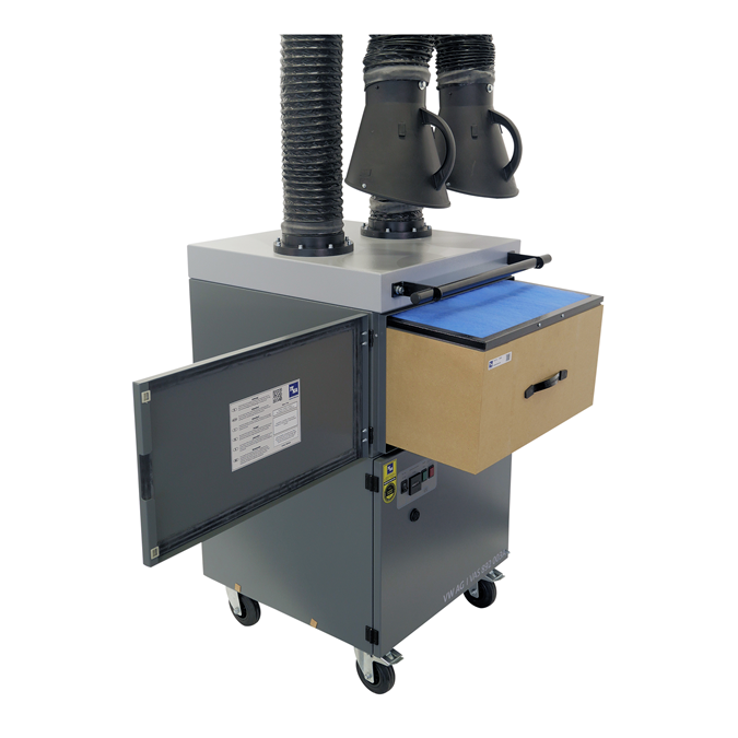 Unité mobile pour l'extraction et la filtration des fumées et des vapeurs de colle générées lors de l'assemblage et de la découpe thermique des métaux et des plastiques. Dans la section de filtration du système, les grosses particules de poussière sont d'abord séparées sur le tapis de pré-filtration. Le filtre à particules qui suit élimine également les fumées et poussières fines. Un système de contrôle automatique des filtres indique quand il est nécessaire de les nettoyer ou de les changer. L'unité est équipée de deux bras d'extraction de tuyau avec des joints internes. Un nouveau type de support à ressort à l'intérieur des bras d'extraction permet d'ajuster facilement les bras dans n'importe quelle position. La hotte d'aspiration avec vanne d'étranglement intégrée peut être pivotée dans n'importe quelle direction et l'air purifié est renvoyé dans la zone de travail. Pour l'application vapeurs de colle, un filtre supplémentaire à charbon actif est utilisé, qui retient les gaz et les odeurs désagréables.