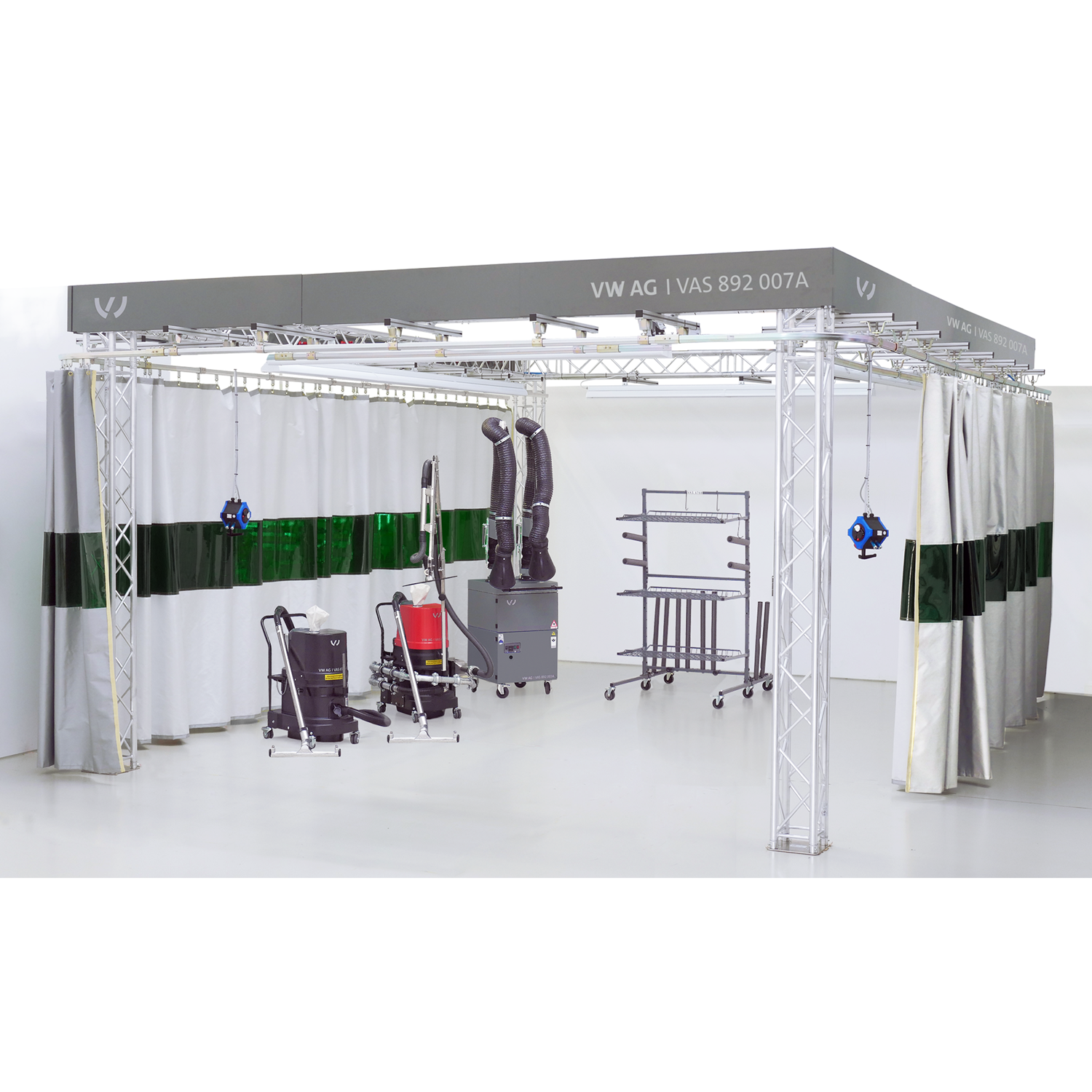 Mit dem Carrosserie -Arbeitsplatzsystem Profi kann die Instandsetzung von Fahrzeugen in Mischbauweise prozesssicher, gemäss den Reparaturvorgaben, durchgeführt werden. Das Carrosseriearbeitsfeld wird durch einen speziell beschichteten Schweissschutzvorhang vom umliegenden Bereich abgetrennt. Durch die integrierte grüne Lamelle sind unbeteiligte Personen vor den Gefahren des Schweissens bestens geschützt. Der Vorhang und ein LED-Lichtsystem sind an einem hochwertigen Aluminium-Traversen-Trägersystem befestigt. Das LED-Lichtsystem sorgt dabei für optimale Lichtverhältnisse und zeichnet sich außerdem durch eine hohe Energieeffizienz und Robustheit aus. Die Druckluft- und Energieversorgung erfolgt über zwei fest eingebaute, stationäre Medienversorgungen mit robustem Gummigehäuse. Im Lieferumfang enthalten sind eine Absauganlage für Aluminium / CFK Stäube mit Funkenfalle, ein Teleskop-Absaugarm sowie eine Absauganlage für Stahlstäube, zusätzlich eine mobile Rauchabsaugung für Schweissrauch und Klebedämpfe und die entsprechenden Filtereinsätze.