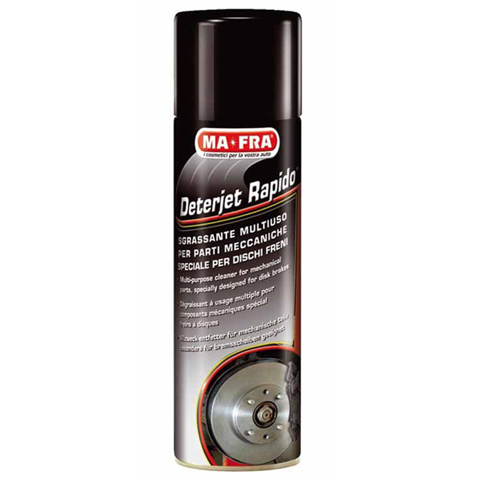 Der schnelle und effiziente Mehrzweck-Entfetter. Seine Wirkung ist ausgezeichnet, es penetriert tief zwischen die Verkrustungen und entfernt von den behandelten Bereichen schnell Schmutz aller Art, Fett, Öl und Bremsflüssigkeit, ohne das man die zu reinigende Teile demontieren muss. Worüber wir sprechen? Natürlich über das neue DETERJET RAPIDO, der Entfetter aus dem Ma-Fra Forschungs- und Entwicklungscenter, eine ausgezeichnete Methode, um energisch und schnellstens die gesamte Bremsgruppe eines Fahrzeuges, oder im allgemeinen, von Maschinen und Ketten zu reinigen. Sein Hochdruckstrahl wird so gut wie möglich dosiert, wenn man einen Anfangsabstand von 50cm von dem zu behandelnden Teil einhält und dann auf einen Abstand von 20cm übergeht, nachdem man das Produkt einwirken lies. Es muss darauf geachtet werden, dass der Strahl von oben nach unten gerichtet wird. Das Produkt löst sich schnell auf und nachdem man eine gründliche Reinigung durchgeführt hat, genügt ein Lappen, um den Vorgang zu beenden.