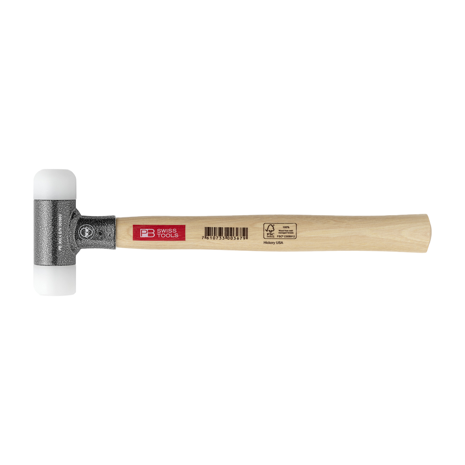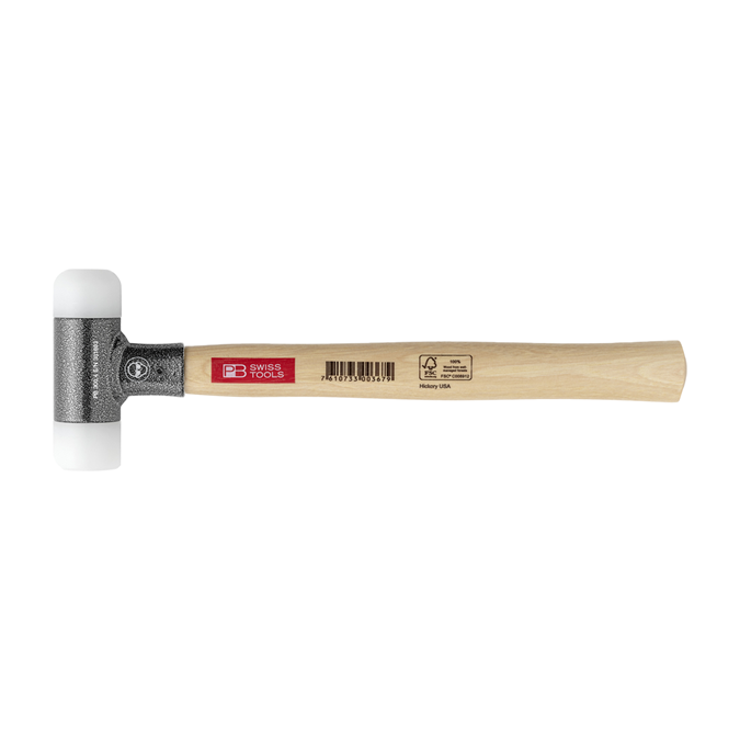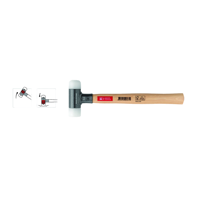 Kunststoffhammer, rückschlagfrei - zum Richten von Werkstücken auf Maschinentischen - für schonende Schläge bei Montagearbeiten - Einsätze aus besonders zähem, verschleissfestem Kunststoff, für eine aussergewöhnlich lange Lebensdauer - Stiel aus FSC® zerti?ziertem Hickory Holz, griffig, robust und dauerhaft - mit Spezialkeil und Schwerspannstift sicher im Stielrohr befestigt, trotzdem leicht auswechselbar - Rückschlagdämpfung durch Gewichte im Hammerkopf, für satte präzise Schläge ohne Rückprall