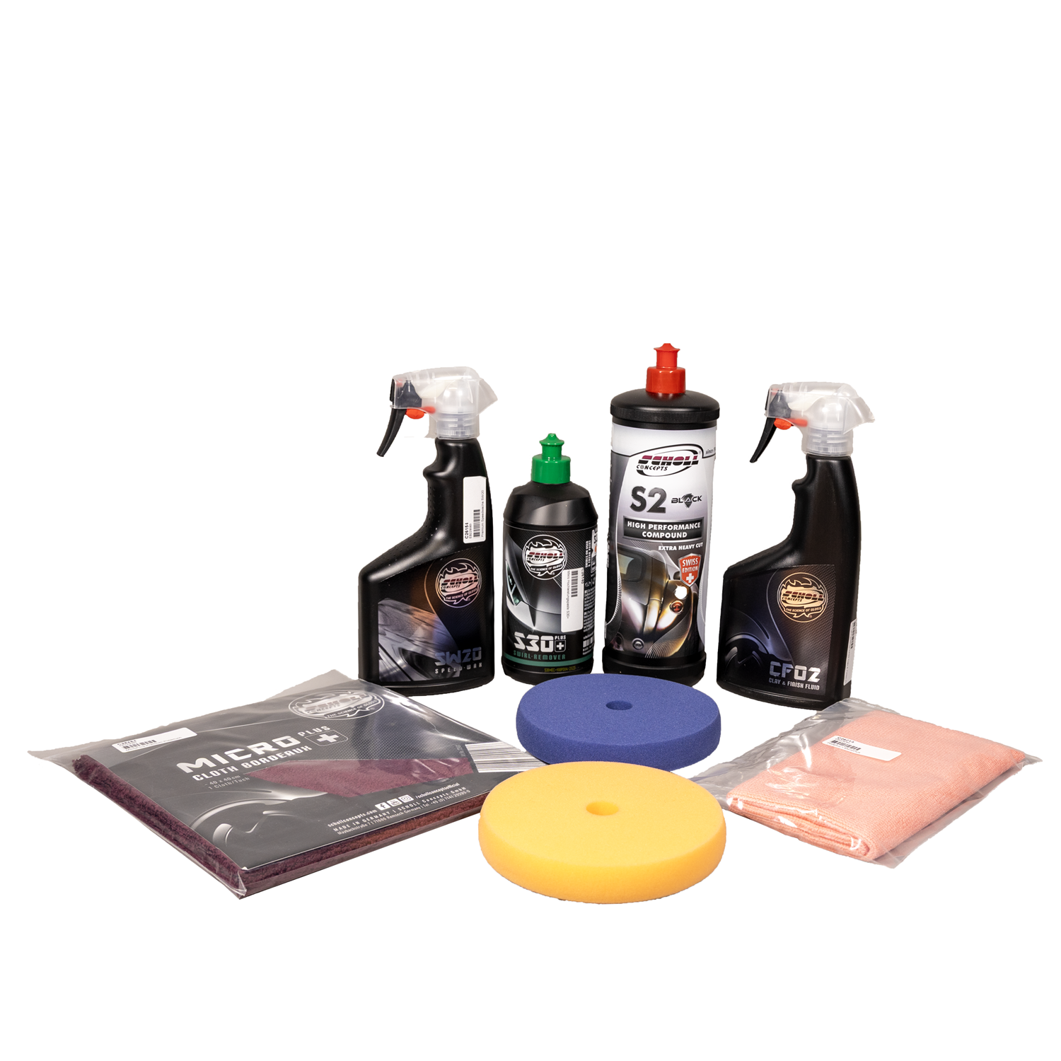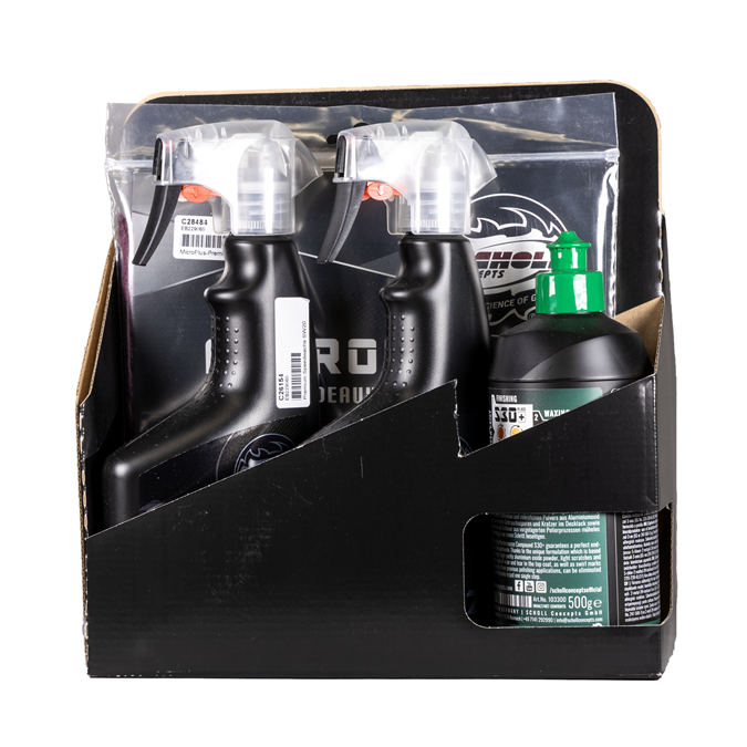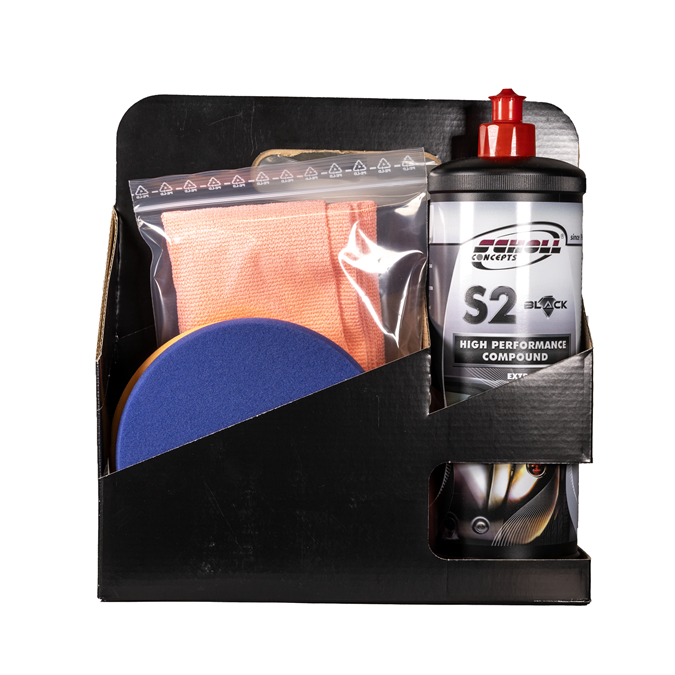 Set contenue: 1 x C26127 Black (Swiss Edition) pâte 1kg1 x C26140 Micro pâte de polissage haute performance S30+ 500g1 x C26737 Spray de nettoyage CF02 Clay & Finish 500ml1 x C26154 Cire rapide Premium SW20 500ml1 x C26219 Chiffon de polissage MicroPlus 40x40cm rouge1 x C28484 Chiffon de polissage MicroPlus 40x40cm bordeaux1 x C26163 Mousse de polissage Spider navy-blue M 145mm1 x C26167 Mousse de polissage orange M 145mm
