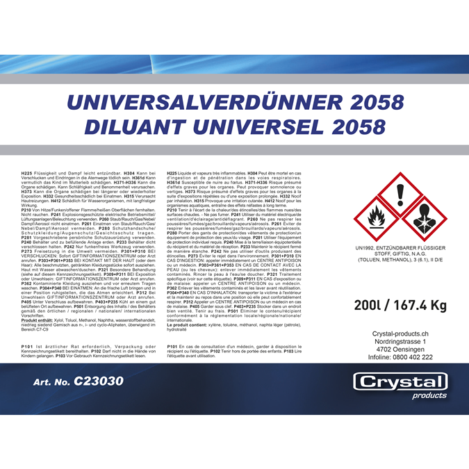 Diluant universel (contenant de l'alcool) pour presque toutes les peintures et vernis à évaporation moyenne. Convient à tous les liants et systèmes de peinture commerciaux. Convient parfaitement à la résine synthétique, au peinture nitro et aux peintures industrielles. Très bonne application lors de la pulvérisation.
