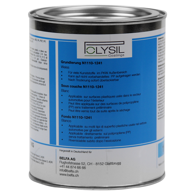 POLYSIL N1110, un apprêt complet qui agit également comme promoteur d'adhérence. L'activation et le revêtement de surface se font en une seule opération. Les surfaces apprêtées avec POLYSIL peuvent être peintes avec des couches de base disponibles dans le commerce ainsi qu'avec des laques à 1 ou 2 composants. Le prétraitement conventionnel par flammage, tempérage et ponçage n'est plus nécessaire.