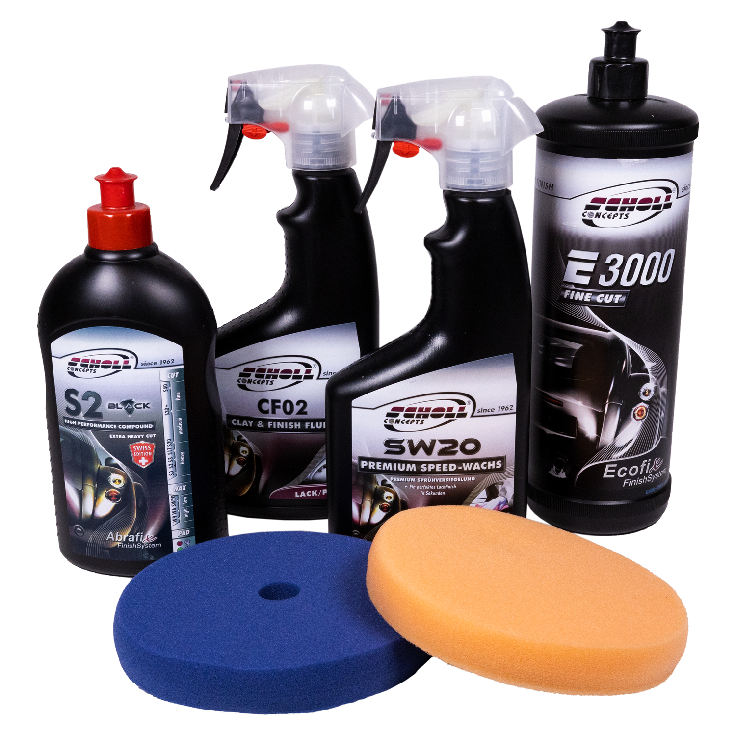 Set enthält: 1 x Premium Speedwachs SW20, 1 x Polierschwamm Spider Pad navy-blue, 1 x Black (Swiss Edition) 1-Step Paste S2, 1 x Fine Cut Paste E3000, 1 x Polierschwamm medium, 1 x Reinigungsspray CF02 Clay & Finish Fluid