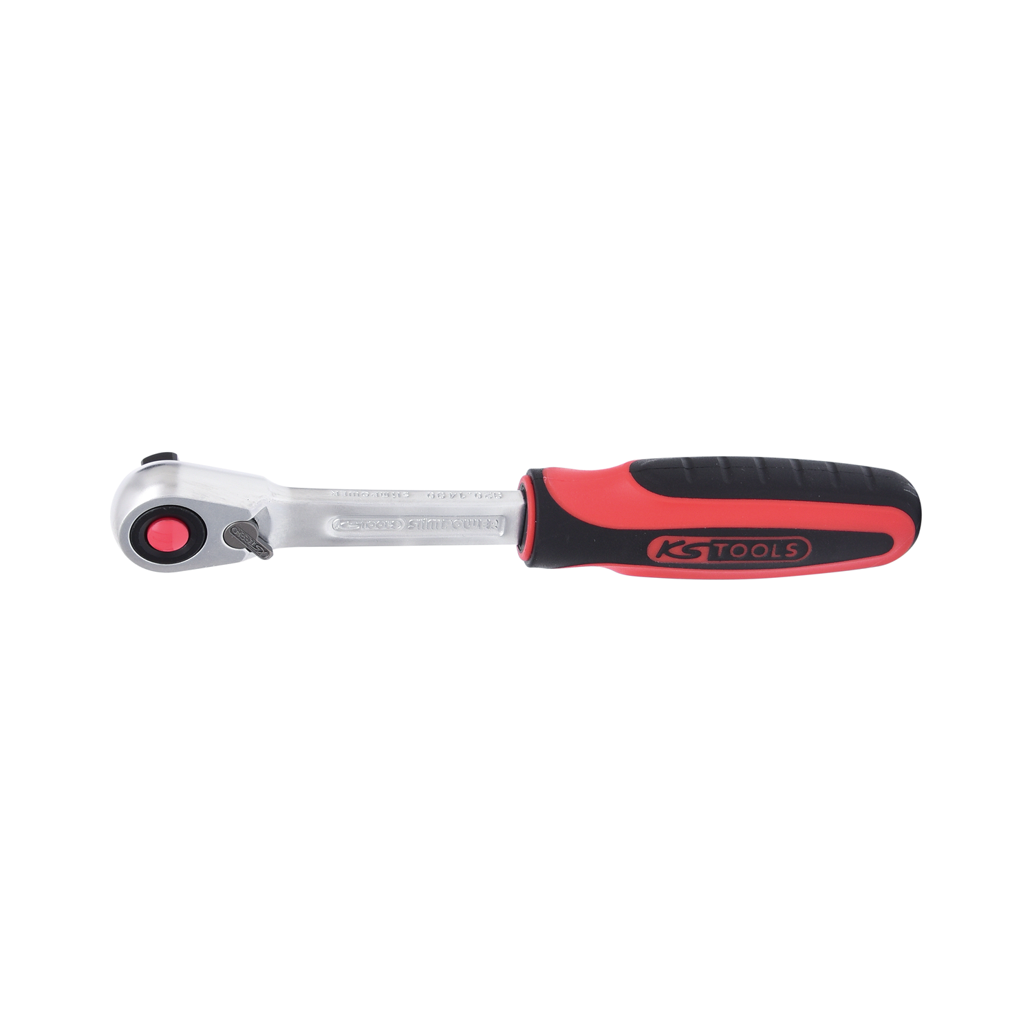 Vierkantantrieb nach DIN 3120 / ISO 1174 mit Kugelarretierung - umschaltbar - extrem schlanker Kopf - fein verzahnter 72-Zahn Ratschenmechanismus - mit Druckknopf Schnelllösefunktion am Ratschenkopf - ergonomischer 2-Komponenten-Griff mit Weichzone - hochglanz verchromt